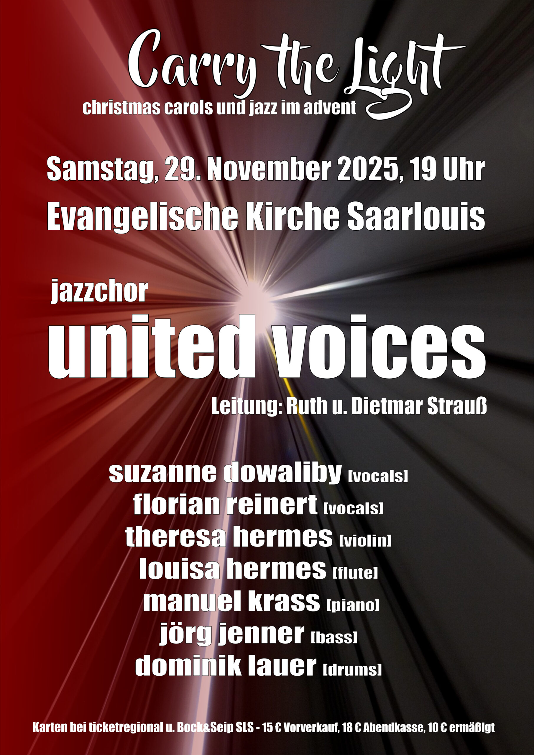 Unter dem Titel „Carry the Light“ stimmen wir uns gemeinsam mit Ihnen am Samstag, 29. November in den Advent ein. Unser traditionelles Advents- und Weihnachtskonzert findet auch in diesem Jahr wieder in der Evangelischen Kirche Saarlouis statt. In einer warmen und stimmungsvollen Atmosphäre bringen wir Ihnen neue und bekannte Musikstücke aus den Genres Jazz, Swing, Gospel, Pop und Klassik zu Gehör. Dabei werden wir wie gewohnt in professioneller Art unterstützt von Suzanne Dowaliby und Florian Reinert (Gesang), Jörg Jenner (Bass), Manuel Krass (Klavier), Dominik Lauer (Schlagzeug) sowie Louisa und Theresa Hermes (Flöte und Violine).